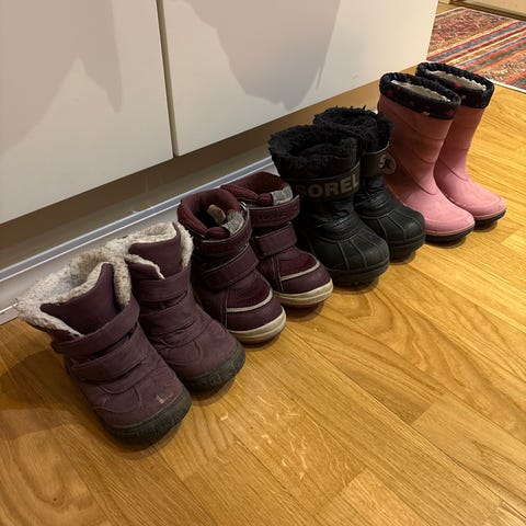 Muutamia kertoja tepastellut vedenpitävät talvikengät, sisäpituus 16,2 cm. Väri on pinkki-musta. Koiratalous.