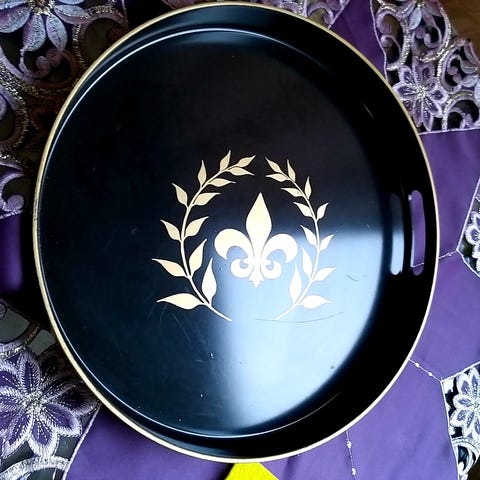 Puinen hedelmäaiheinen pyöreä iso tarjotin. Halkaisija on 44 cm. Hyväkuntoinen