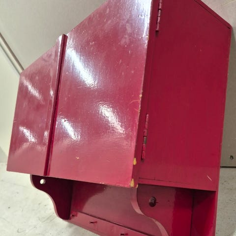 Vanha vahvaa puuta oleva talonpoikaistyylinen seinäkaappi. Etuovi puuttuu, oikea sivuseinä jostakin syystä saranoitu ja alhaalla pohjassa reikiä 3 kpl. Johonkin hommaan siis tehty, vähän kuin olisi vaikka kello punnuksineen ollut sisällä tai suunnitelmissa. Kokonaiskorkeus vajaa 64 cm, leveys noin 38,5 cm.