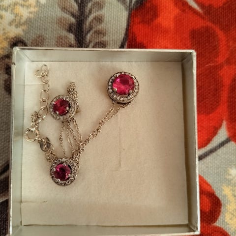 Hopea korusetti, joka sisältää kaulakorun ja korvakorut. Tammi jewellery, Sademetsä. Suunnittelija Marjut Kemppi. Kaulakoru ja korvakorut on valmistettu hopeasta ja niissä on koristeelliset lehtikuviot. Setti sopii hyvin juhlatilaisuuksiin tai arjen piristykseksi. Ovh kaulakoru 135 € ja korvakorut 125 €. Nyt yhteishintaan 150 €.