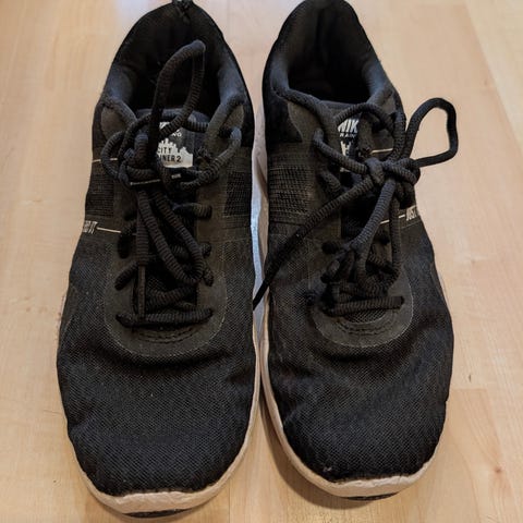 Yhdellä lapsella käytössä olleet Nike tennarit. Toisessa kengässä kulumaa jalantiessä (toiseksi viimeinen kuva)