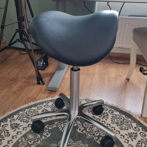 Satulatuoli, istuinosa mustaa nahkaa, korkeussäädettävä matalasta korkeeseen 52-72 cm (tämä tuoli sopii säätönsä ansiosta myös pienikokoiselle ihmiselle), istuimen kallistuksen säätö, jalusta/jalkaristikko halkaisija 50 cm, kiillotettu alumiini (KAL), pyörät. Jousi, kallistus - säädöt toimivat moiteetta. Ergonominen istua ja selkäystävällinen. Työpaikalle tai kotiin työtuoliksi.