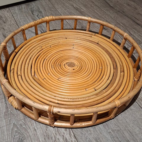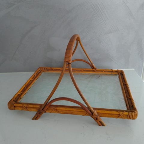 Myydään sangallinen rottinkitarjotin huurrelasitasolla. Kunto hyvä. Hinta 20 e.