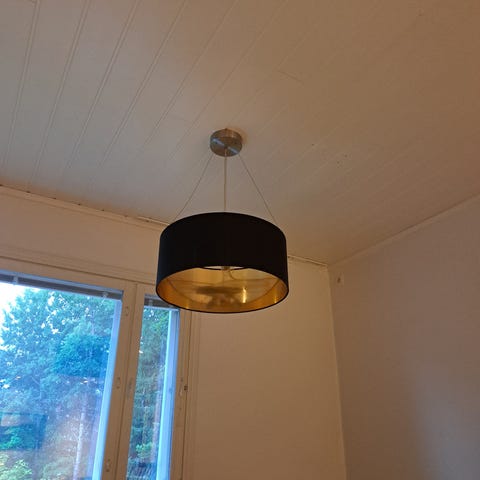 Musta kromi valaisin/kattolamppu, itsellä ei tullutkaan käyttöön. Mukana mattamusta kattokuppi, vaikka näyttääkin kuvassa hieman siniseltä. Nouto Martinlaaksosta tai toridiili/postitus :)
