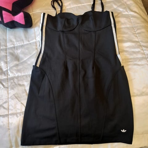 Adidaksen mekko koossa L. Päällyskangas meshiä, alla hieman liukaspintainen vuori jossa Adidas logo. Kunto uudenveroinen.