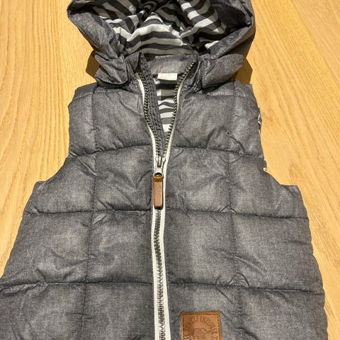 Lämmin ja paksu toppaliivi taaperolle. Koko 86, mutta ollut käytössä jo kokoa aiemmin. Tosi hoikalle 86 pitkälle menee myös varmasti hyvin. Kunnossa ei moitteita. Materiaalilappua ei ole.