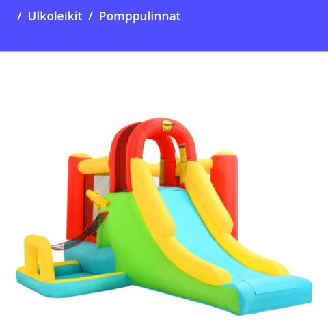 Hinta sisältää: pomppulinna, puhallin, alustapressu ja kiinnitystarvikkeet.