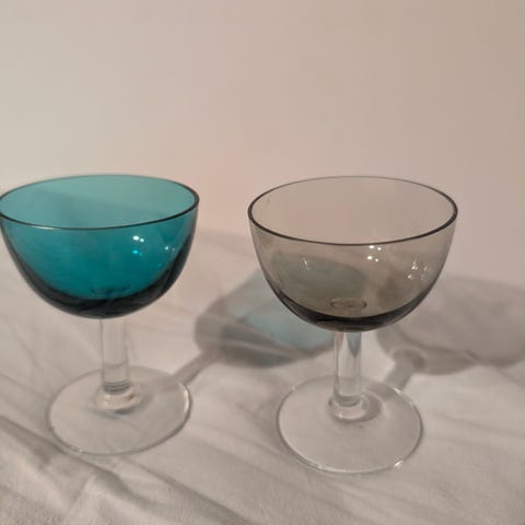 Jalalliset tilavat lasit ihanaa vanhaa, ohutta suupuhallettua lasia. Ns. pallojalka. Korkeus/maljaosan halkaisija noin 12,5/8 cm. Juomille tai jälkiruoan tarjoiluun.