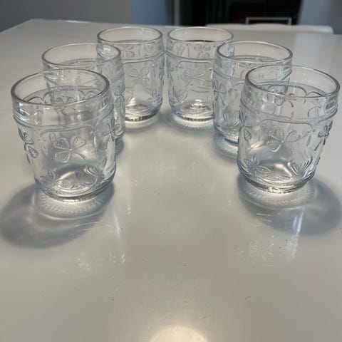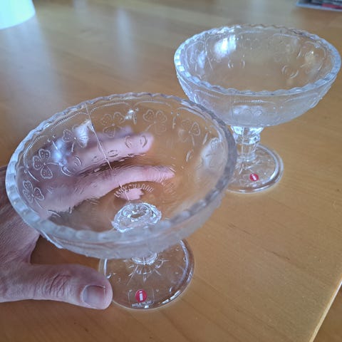 Kerttu Nurmisen suunnittelemat ja Nuutajärven valmistavat Apila juomalasit. Lasi on kirkasta ja kuviot todella kauniit.