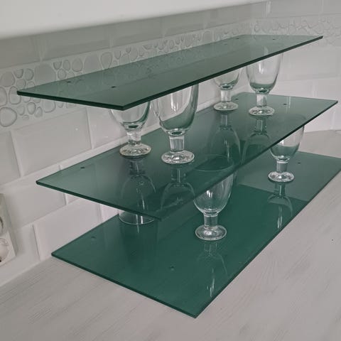 Myydään kokonaan ehjä seinälle ripustettavaksi tarkoitettu lasihylly ja sen alkuperäiset kiinnikkeet. Nouto Ritaharjusta.
