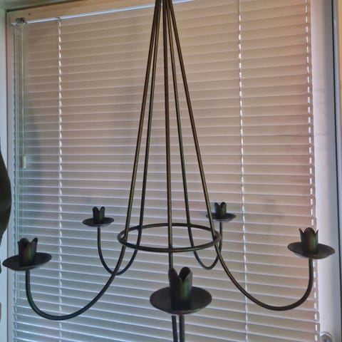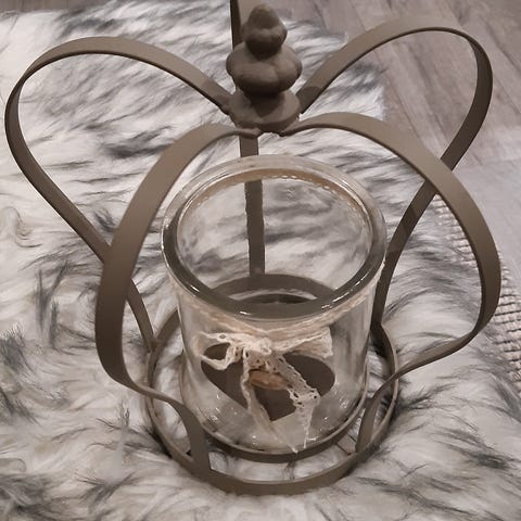 Kaunis, metallinen ketjuissa roikkuva neljällä lasikupilla oleva tuikkukruunu, ketjun kokonaispituus on 83 cm ja metalliastian läpimitta 18 x 18 cm, 10 e + mahdolliset postikulut