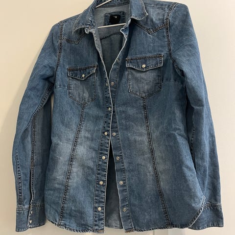 Only -merkkinen sininen farkkutyylinen naisten paita kauniilla koristeilla. Kulutetun näköinen look. Koko 36.