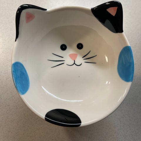 Keraaminen kissankuppi. Väri valkoinen. Pohjassa neljä silikonitassua pitävät kupin hyvin paikoillaan. Kupin halkaisija 18 cm (sisähalkaisija noin 15 cm), korkeus 4,5 cm. Paino noin 700 grammaa.