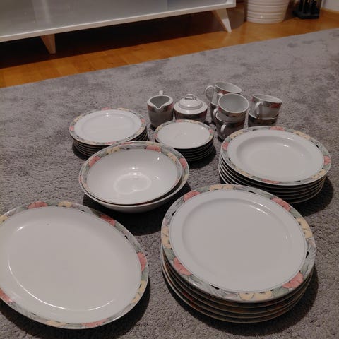 Sisältää soppakulhon, 2 isoa tarjoiluastiaa, sokerikon, 6 syvää lautasta, 6 ruokalautasta, 7 leipälautasta ja 5 jälkiruoka/pientä lautasta. Myydään settinä. Ei juurikaan käytetty.