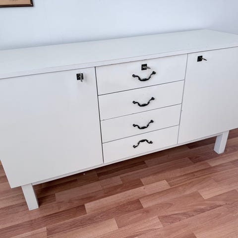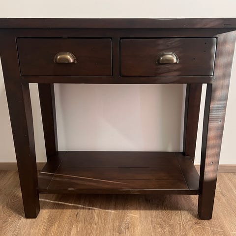 Tyylikäs puinen pieni lipasto / sivupöytä pyörillä. Hienosti koristeltu, funkkis henkinen.