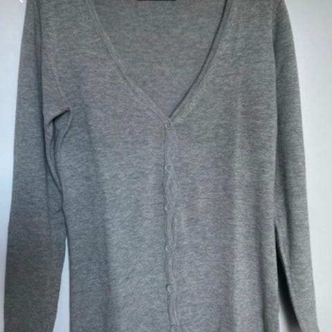 Pitkä avonainen villapaita, jossa taskut. Villasekoitus, jossa mm. villaa ja mohairia. Pinta hieman nyppyinen, kuten kuvista näkee. Kuvissa oleva vyö ei kuulu kauppaan. Helmassa halkiot sivuilla. Väri harmahtava vihreä / salvian värinen.