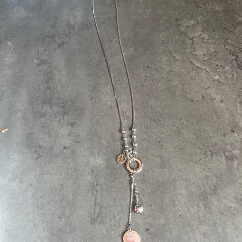 Käyttämätön hopeinen kaulakoru kahdella riipuksella. Ketjun pituus 38cm