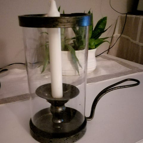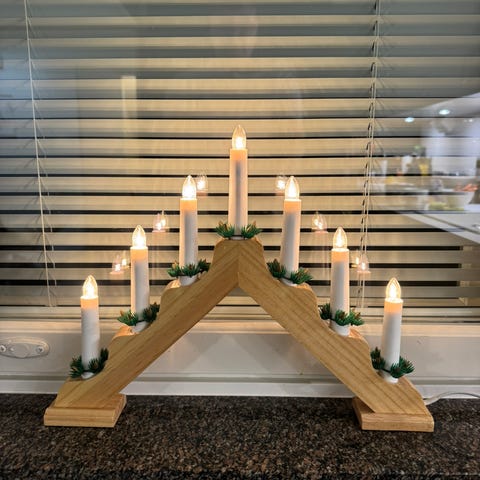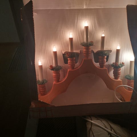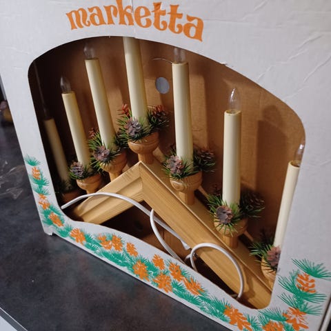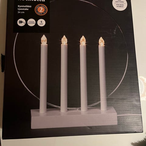 Myydään puinen kynttelikkö koristeilla.