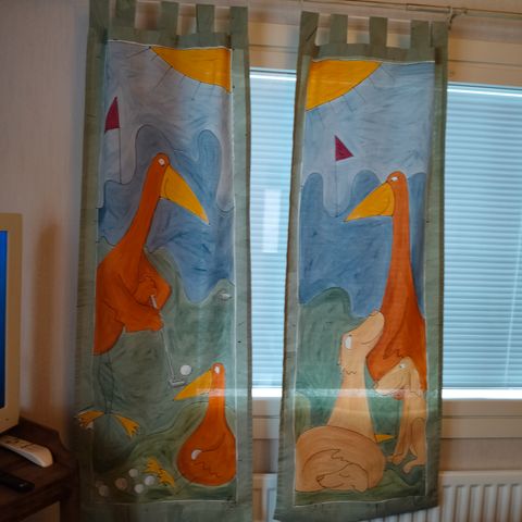 Sympaattiset Mikko Mallikas -verhot 2 kpl. Koko leveys 135, pituus 144. Reilu käänne 9 cm, jolla saa tarvittaessa lisäpituutta.