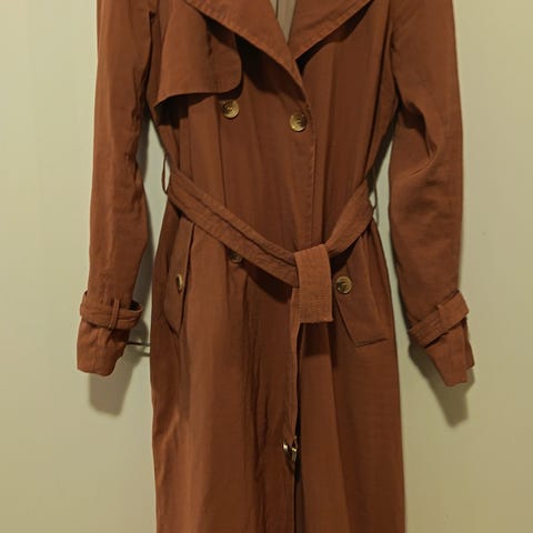 Musta Kestilän trenssitakki. Kokolapussa lukee 46 mutta sanoisin koko M