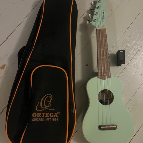 Myydään täydellisessä kunnossa oleva, melkein käyttämätön vaaleanpunainen Fender ukulele.