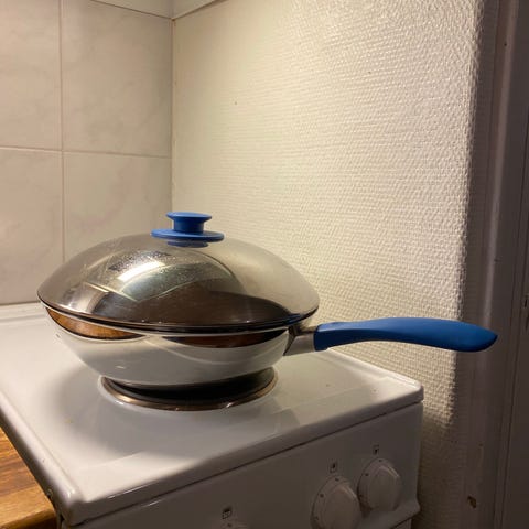 Uudenveroinen, kerran kokeiltu wokkipannu ritilällä, tarttumaton pinnoite, puukahvat, halkaisija 35 cm.
