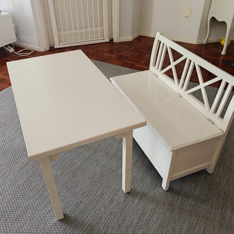Puinen penkki lapselle keltainen ja punainen väriltään, koko korkeus 62 cm, istuin osan korkeus 32 cm, leveys 79 cm, syvyys 31 cm,