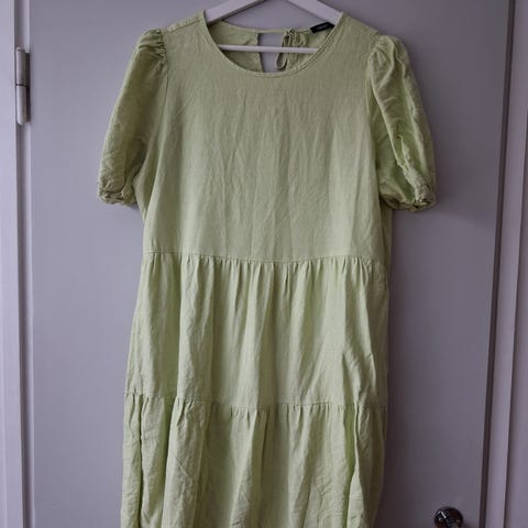 Hakusanoja: kesä pellava mekko juhlamekko ylioppilasmekko ylppärimekko leninki viileä hellemekko vihreä keltainen lime kesämekko minimekko mini lyhyt nanson S M uudenveroinen