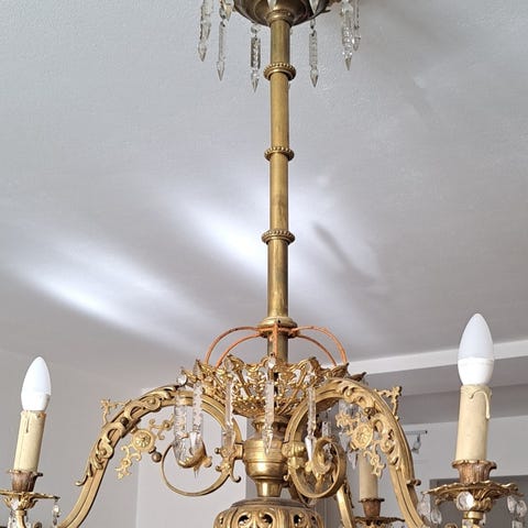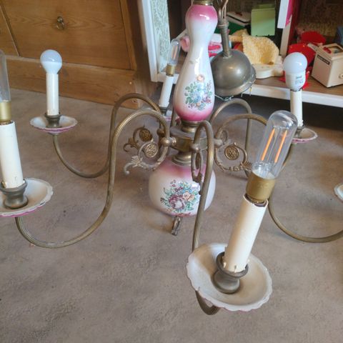 Messingin sävyinen kattokruunu koristellisilla kuplalasilla varjostimilla. Helena tynellin valaisin.