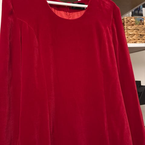 Koko 38, kai-kai 44cm, olka-helma 96cm, vyötärö kapeimmasta kohdasta n. 40cm. Kankaassa on hankauma vyön yläpuolella, joka ei käytössä näy mutta henkarissa roikkuessa kyllä.
