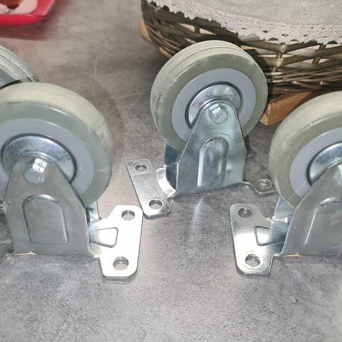 2 kappaletta nailonpyöriä laakereilla, joita käytetään pumppukärryjen isoina pyörinä.