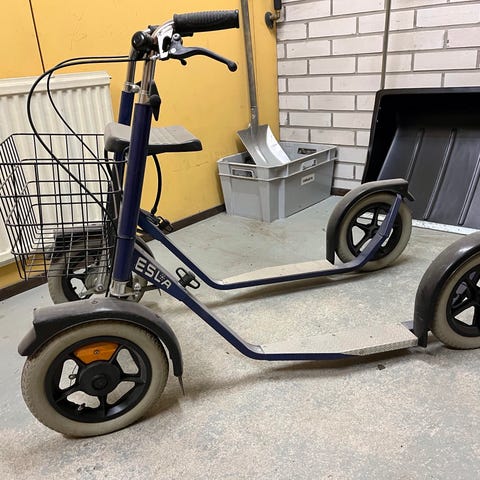 Merkki Malli potkupyörä on vanhusväelle käyttöön sopiva. Sen sininen runko on valmistettu kestävästä materiaalista, joka on suojattu ruostetta vastaan. Potkupyörässä on neljä pyörää, jotka tarjoavat vakautta ja helppoa liikkumista erilaisilla alustoilla. Etuosassa on kori, joka mahdollistaa pienten tavaroiden kuljetuksen.Sisärenkaat juuri uusittu.