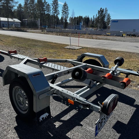 Järeä traktorivetoinen venetraileri. Kantavuus 8 tonnia ja kyytiin mahtuu 9metrinen liukuvarunkoinen vene helposti. Säädettävä aisa, kuvissa aisa lyhimmillään koska pikkuveneitä kyydissä. Valmistettu uusista osista ja uudesta teräksestä v.2021 metalliammattilaisten toimesta. Säilytetty aina sisällä.