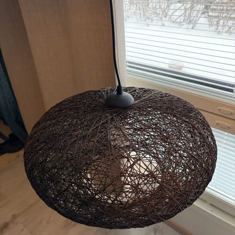 Myydään valaisin EGLO 900429 Väri beige , musta kangaspääll. johto, max.pituus 108cm, pidin e27, asennuskontruktio muutettu kattokoukkuun sopivaksi ja samalla messinkinen kattokuppi , valaisimen halk. 38cm , täysin uudenveroinen , ei naarmuja eikä lommoja ,mukaan uusi led-lamppu ostajan valinnan mukaan ja tarvittaessa valaisinpistotulppa