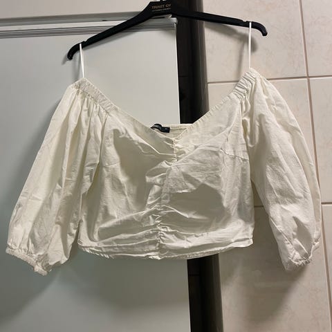 Valkoinen koon 34 paita. Paidassa rypytettävät 3/4 hihat, sekä takaa kaareva ja pidempi helma.