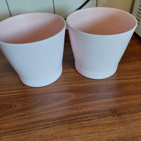 Kaksi papaja aniliininpunaista ruukkua. Käytön jälkiä löytyy. Toisesta lohjennut pieni pala näkyy kuvassa