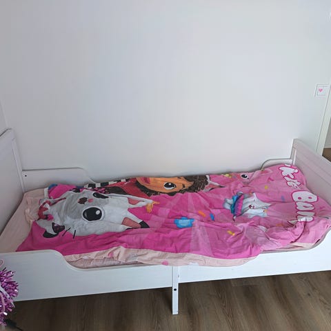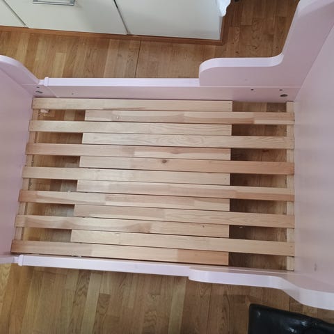Tämä on 90×200 cm sänky, jonka korkeus lattialta nukkumispinnalle on noin 40 cm. Sängyn rungon yksi säle oli rikkoutunut, mutta se on korjattu ja vahvistettu. Sänkyyn kuuluu kaksi patjaa: sininen patja on hieman kovempi ja sen päällä on JYSKin patja. Mukana tulee myös sänkypeite. Poikamme on käyttänyt tätä sänkyä muutaman vuoden; patjat ja peite ovat edelleen melko uusia, mutta vaihdoimme hänelle nyt leveämmän sängyn.