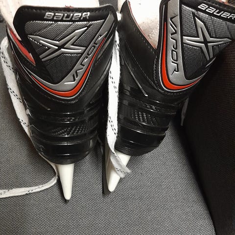 Bauerin luistimet. Kokomerkintää ei näy, mutta pohjallisen mitta 21,5 cm. Ehjät kauttaaltaan, mutta naarmuja löytyy, etenkin muovikärjet naarmuiset.