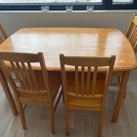 Dinerhill wooden table and 5 chairs, chairs needs to be fixed. Come to pick up during February. Available in Malmi Helsinki