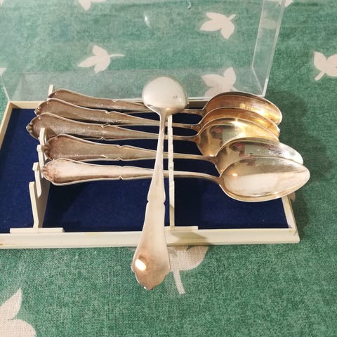Sen voin vinkata, että hinta pyynti n. 200€ paikkeilla.Yhden lusikan ovh. 55€- 72€, eli edullisesti tarjolla. Toki tarjouksia saa myös jättää. Lisäkuvia pyynnöstä, muoveja en mielelläni kyllä avaisi.