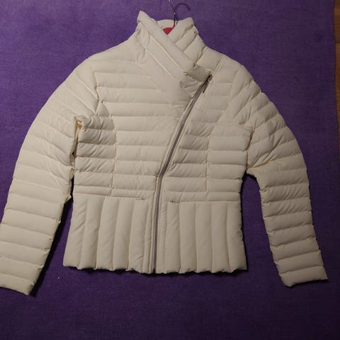 Myydään beige- valkoinen naisten joustava ulkoilutakki.