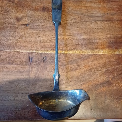 Palisanterivarrella ja ajan patinalla täydennetty kauha. Puu on hiottu sekä öljytty, metalli kiillotettu, joten ei hetkeen tarvitse miettiä kunnossapitoa. 19,5 cm pitkä