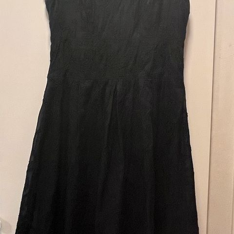 Kiekurakuvioinen, napitettava Betty Barclayn mekko. Mekon taustaväri on musta ja materiaali läpikuultavaa. Sen v-aukkoa koristaa kaulus ja helman reunuksia halkiot. Lisänä kylkipuolten tuplalenksut, joihin saa halutessaan lisättyä nyörit. Mekko on mielestäni hyväkuntoinen, joskin kahdesta napista uupuu kirkkaat kivet (ks. kuva).