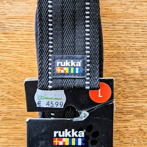 Kuvan panta ollut vähän aikaa käytössä kunnes todettu liian isoksi. Ollut koiran päällä vain lenkkeillessä eikä koko ajan kaulassa. Kaulan ympärys tuotteen sivuilla ilmoitetaan mitassa 50-60 cm. Väri musta. Heijastavat nauhat. Sisäpuolella vähän karvoja ja likaantuneita kohtia. Paksuus 5 cm. Melko suurille koirille paksu panta. Soljessa ja taluttimen kiinnityslenkissä vähän maalin kulumaa. Pehmustettu koko kaulanympärys kohdalta.