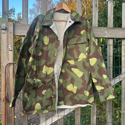 Myydään käyttämätön, aito ja alkuperäinen maastotakki m/62, koko 854. Valmistaja Valtion Pukutehdas, v 1987. Käytettävissä molemmin puolin. Kesäpuoli maastokuvioinen, talvipuoli valkoinen. Taskut ja napit molemmin puolin. Hihansuissa napit. Kauluksessa napit huppua/kypärän huppua varten.