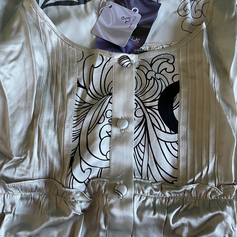 Helmenharmaa, pitkä Stockmann silk -yöpaita, erittäin kaunis kukkakuosi. Vain vähän käytetty. 100 % silkkiä.
