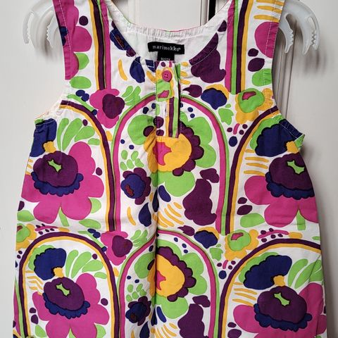 Marimekon tunika koossa 92. Käytettynä ostettu ja hihassa pienet reiät sekä tahra, ei koitettu itse poistaa kummoisemmin. Muutoin hyvässä kunnossa.