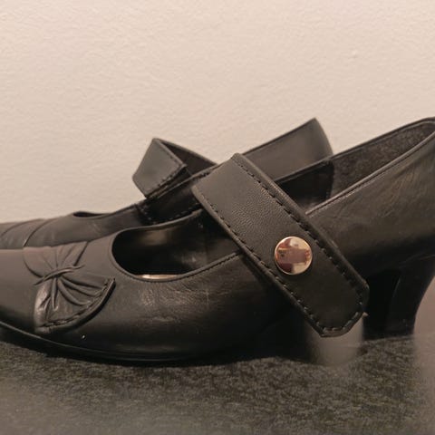 Korko n. 7cm. Mustaa nahkaa, koristeena mokkaruusuke.