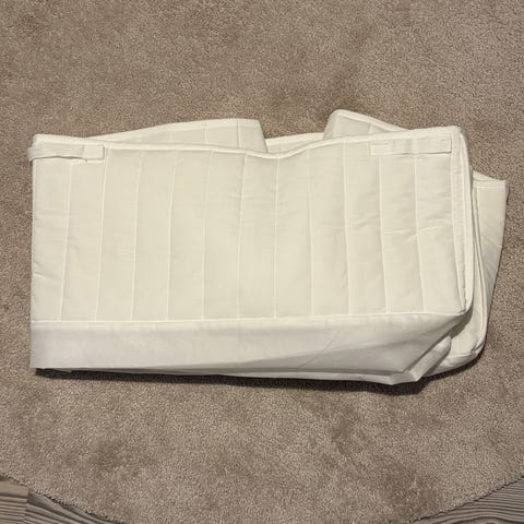 Emma Spjälskydd till spjälsäng köpt 2023. Färg beige. Knyts fast i spjälsängen med snören eller förs mellan varannan spjäle. Längd 360 cm, passar sängar som är 120 x 60 cm, täcker alla sidor. Tvättat med oparfymerat tvättmedel och förvarat i skyddspåsen inomhus. Finns i Vasa, fås till Jakobstad med min tidtabell.
