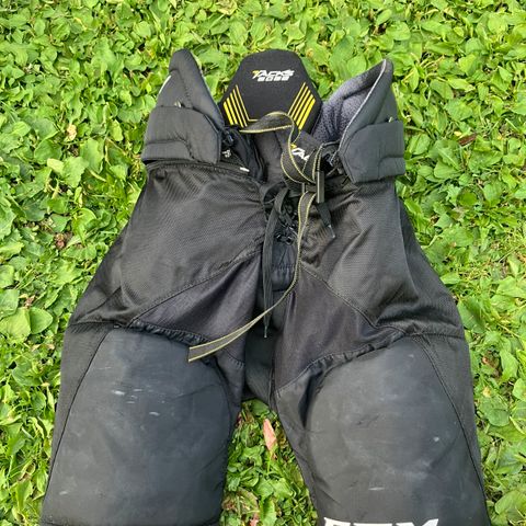 Jääkiekkohousut, joissa käytön jälkiä (ja jopa pieniä reikiä) ja jokin kohta teipattukin, ajavat asiansa. Käytöstä suoraan myyntiin, siirtyminen isompiin.